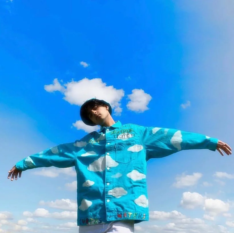 The jacket was a raw piece at the beginning, I dyed it blue, hand-embroidered onto it the moto of my brand, 'I am who I am. Your approval is not needed', in Nepali transcript. I painted clouds all over the blue denim jacket & hat as to me it evoked positivity. There is also a heart under the collar :) The jacket took a month (cries) to get to Curtis, and was such an emotional roller coaster for as I paid for the next day International delivery and the parcel got stuck in customs for weeks, flying back and forth between states due to an error by FedEx and Parcel Force. I was chasing daily - missed his single drop due to the delay and Curtis had started promoting his new single 'Freckles' but finally, weeks later it arrived and Curtis sent through the pictures of him wearing it - he loved it, I was so happy all that hard work did not go down the pan! I suppose the message I am trying to get at is fight those cultural barriers, there are no rules to how you should live your life and what career you SHOULD do. Follow your dreams and do not give up because honestly, you get closer each day. It's bloody hard but focus on the good, overcome the bad, and your already halfway there.